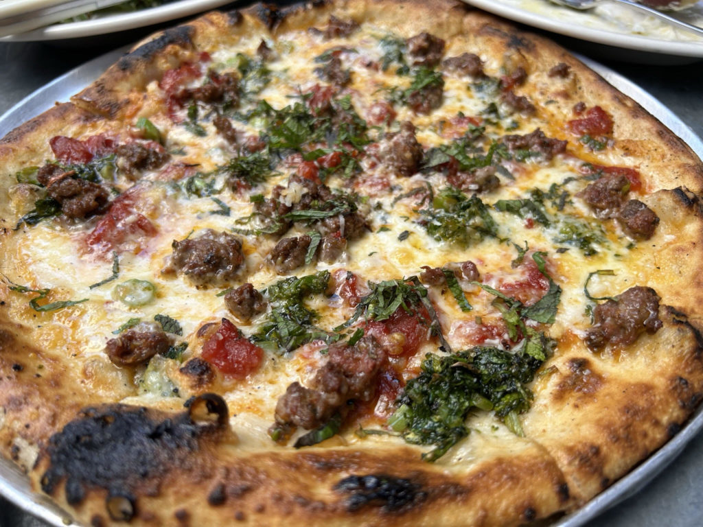 Pizza with Lamb Sausage, Asiago, Confit Tomato, Rapini and Pecorino from Gjelina